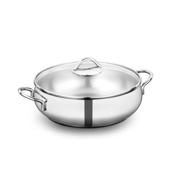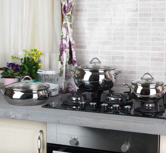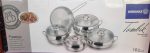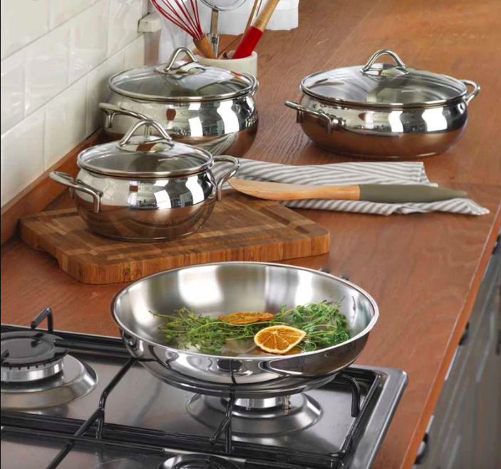 کفه دارای سه لایه چدن کپسول های حرارتی کفه سه لایه برای انتقال یکنواخت حرارت طراحی ارگونومیک و نسوزان دسته ها و درب قابلمه بدنه استیل ۱۸/۱۰ کروم نیکل شامل: قابلمه قطر ۱۶ سانتی متر، ارتفاع ۹ سانتی متر با درب قابلمه قطر ۲۰ سانتی متر، ارتفاع ۱۰ سانتی متر با درب قابلمه قطر ۲۴ سانتی متر، ارتفاع ۱۲ سانتی متر با درب تابه قطر ۲۴ سانتی متر، ارتفاع ۸ سانتی متر دودسته با درب تابه قطر ۲۴ سانتی متر، ارتفاع ۵ سانتی متر تکدسته بدون درب ساخت ترکیه